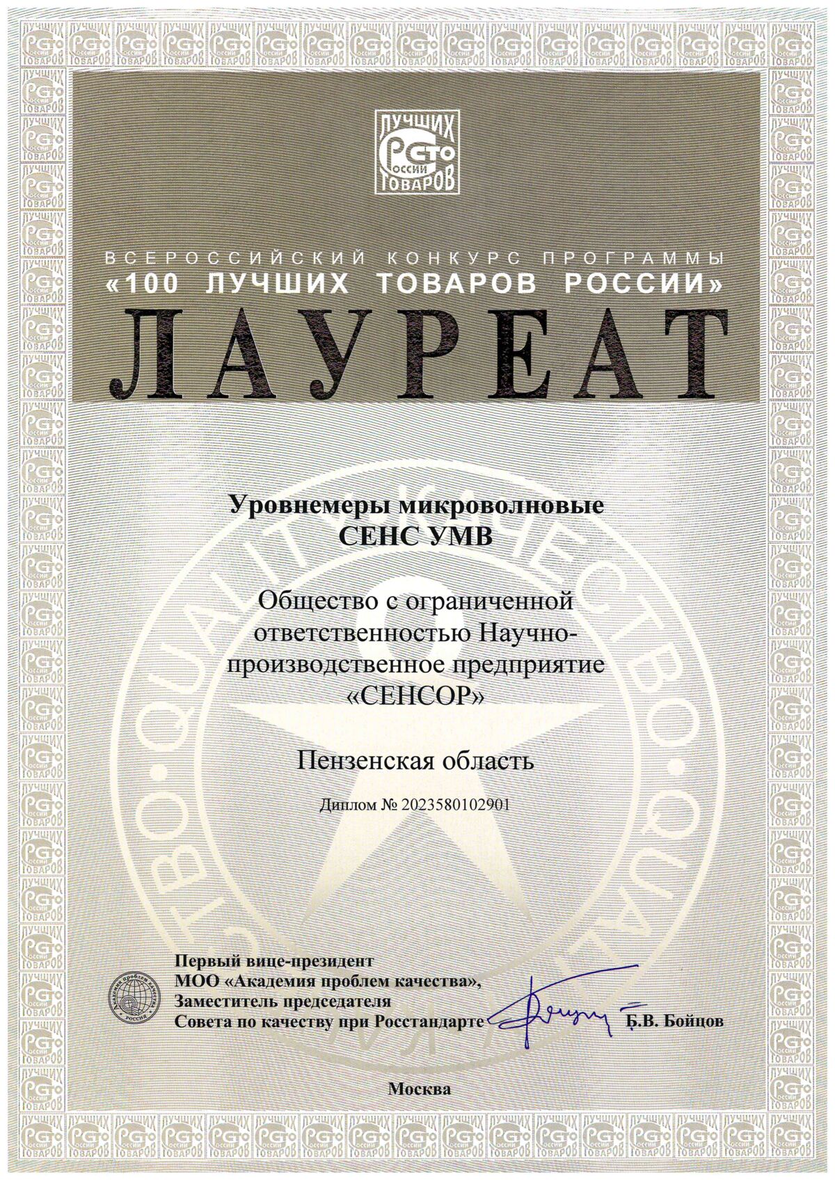 17 ноября 2023 года были подведены итоги всероссийского конкурса программы «100 лучших товаров России». В этом году на конкурс НПП «СЕНСОР» представило Уровнемер микроволновый СЕНС УМВ, который стал лауреатом в номинации «Продукция производственно-технического назначения».