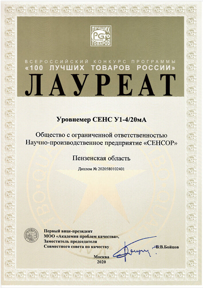 3 декабря 2020 года были подведены итоги всероссийского конкурса программы «100 лучших товаров России». Лауреатом конкурса в номинации «Продукция производственно-технического назначения» стал уровнемер СЕНС У1-4/20мА.