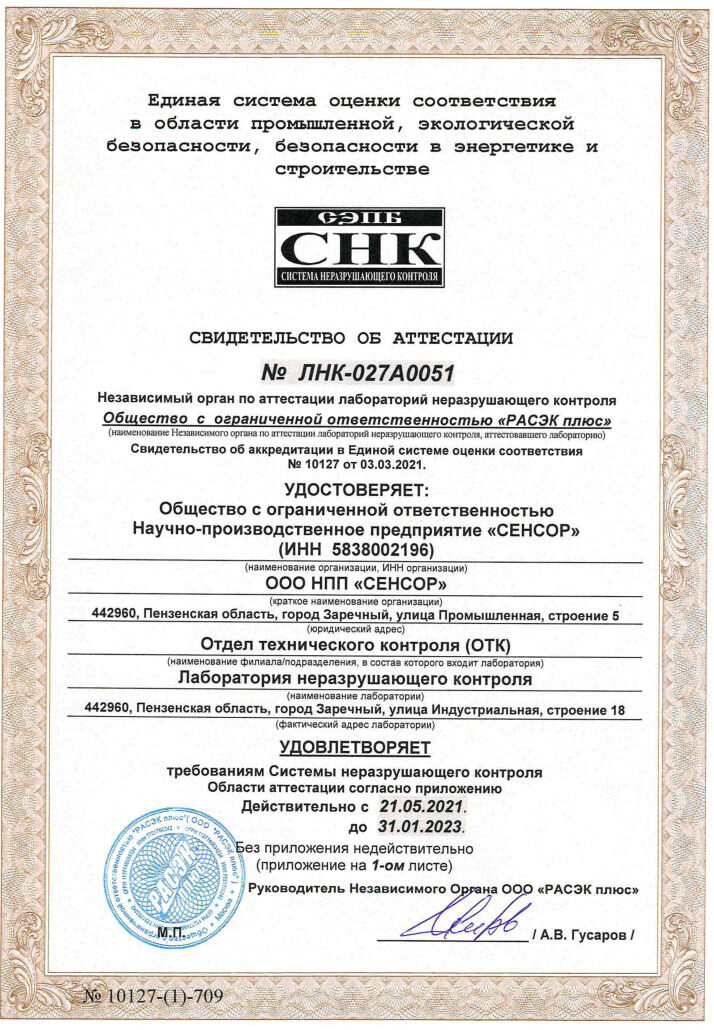 Лаборатория неразрушающего контроля (ЛНК), входящая в состав Отдела технического контроля (ОТК) научно-производственного предприятия «СЕНСОР», была аттестована независимым органом по аттестации ЛНК, функции которого осуществляет ООО «РАСЭК».