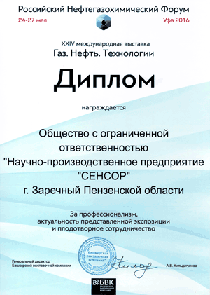По итогам выставки НПП «СЕНСОР» отмечено дипломом Башкирской выставочной компании за профессионализм, актуальность представленной экспозиции, плодотворное сотрудничество.