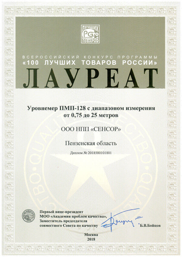 20 декабря 2018 года были подведены итоги всероссийского конкурса программы «100 лучших товаров России». Лауреатом конкурса в номинации «Продукция производственно-технического назначения» стал Уровнемер ПМП-128 с диапазоном измерения уровня 0,75 до 25 м.