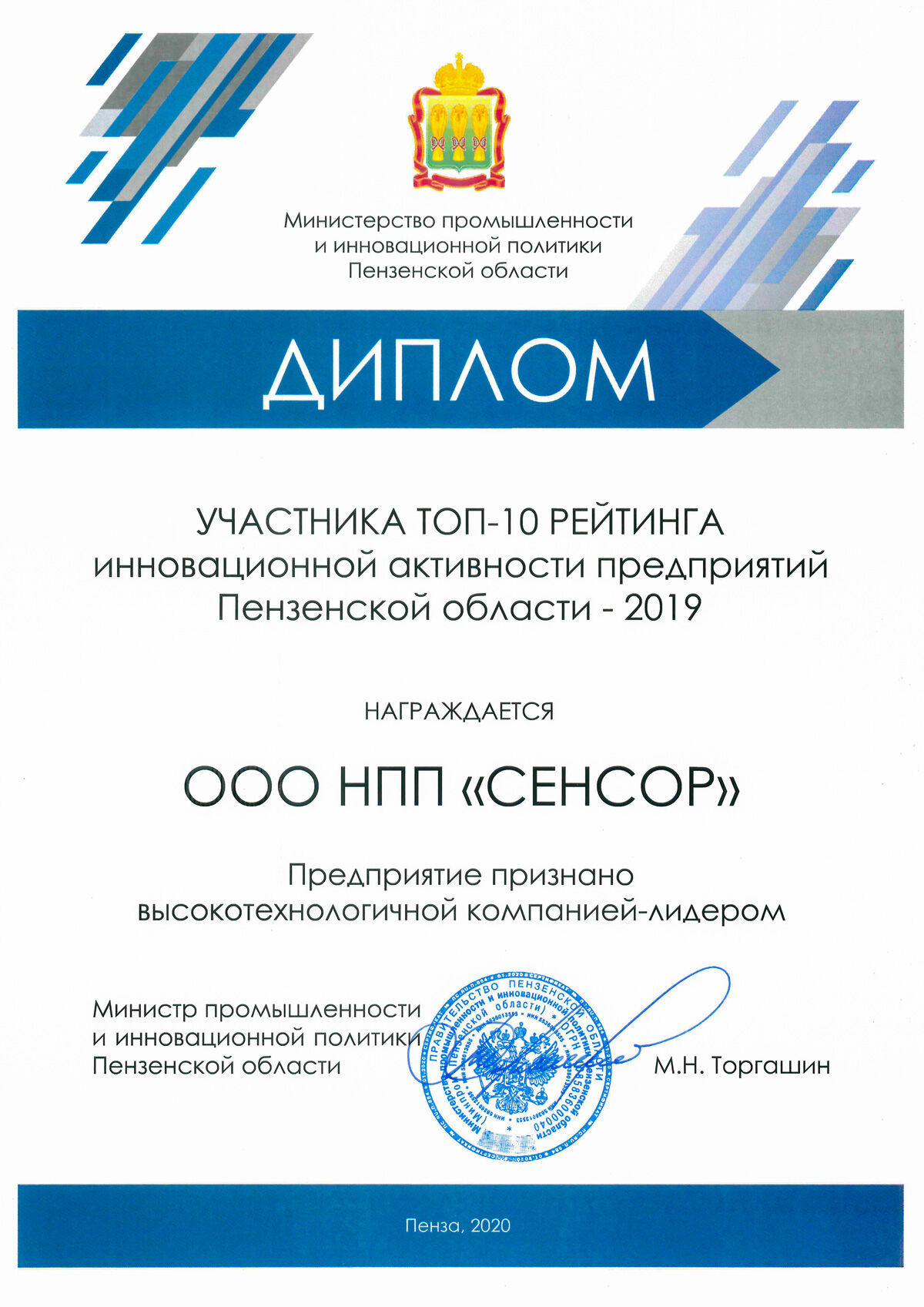 НПП «СЕНСОР» вошло в Топ-10 инновационно-активных предприятий Пензенской области